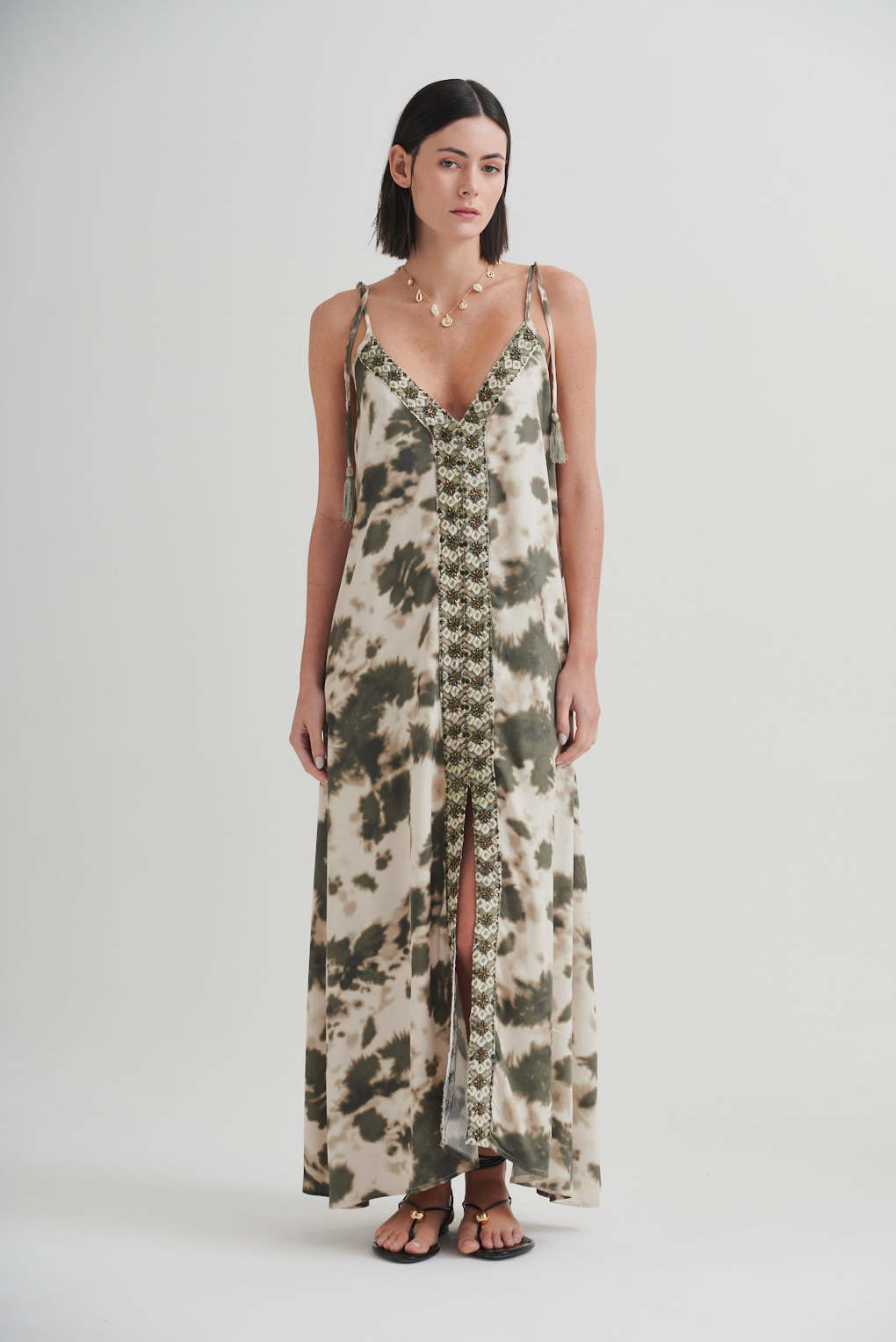 El Vestido Judhit está confeccionada en jacquard de viscosa, una tela liviana con textura suave y caída fluida. Su diseño se destaca por el escote en V, los volados en el frente y mangas, y un delicado bordado con pequeñas lentejuelas que suman un toque de brillo. Cuenta con elástico en la cintura y tiras internas para regular el ajuste. Además, se ata en la espalda con lazos que permiten jugar con el calce.