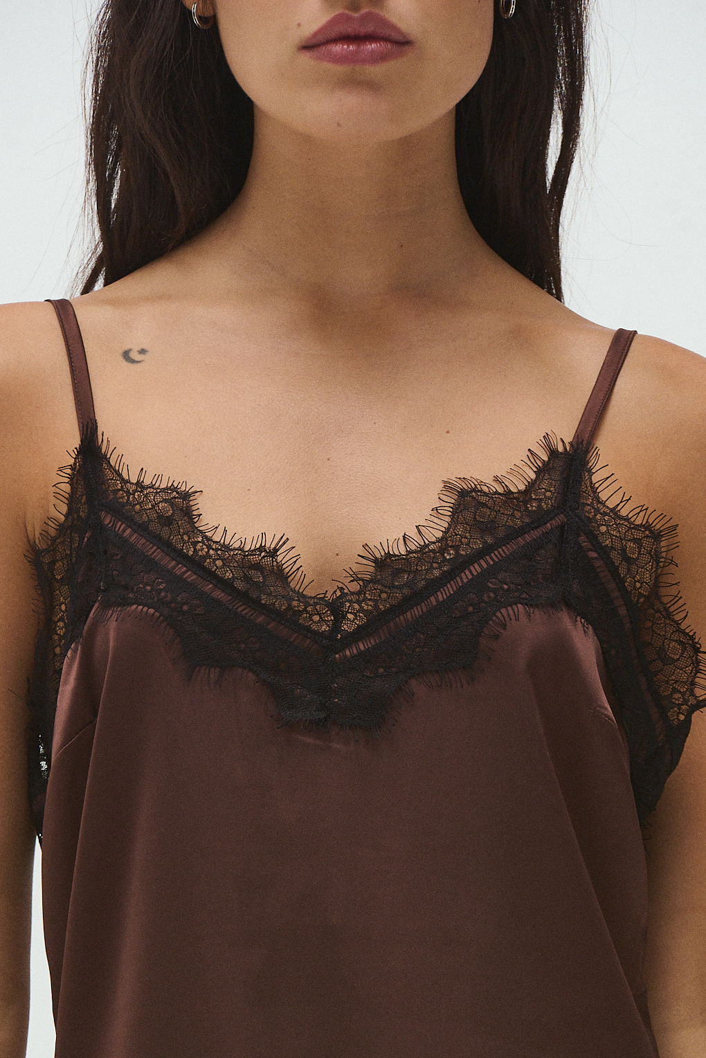 El Vestido Natalie está confeccionado en satén, un tejido suave y liviano que aporta una caída fluida y elegante. Su diseño presenta breteles finos y escote con detalle de puntilla, que suman un aire femenino y sofisticado. La silueta simple y alargada lo convierte en una prenda versátil que puede usarse tanto sola como combinada con otras prendas para lograr looks modernos y urbanos.