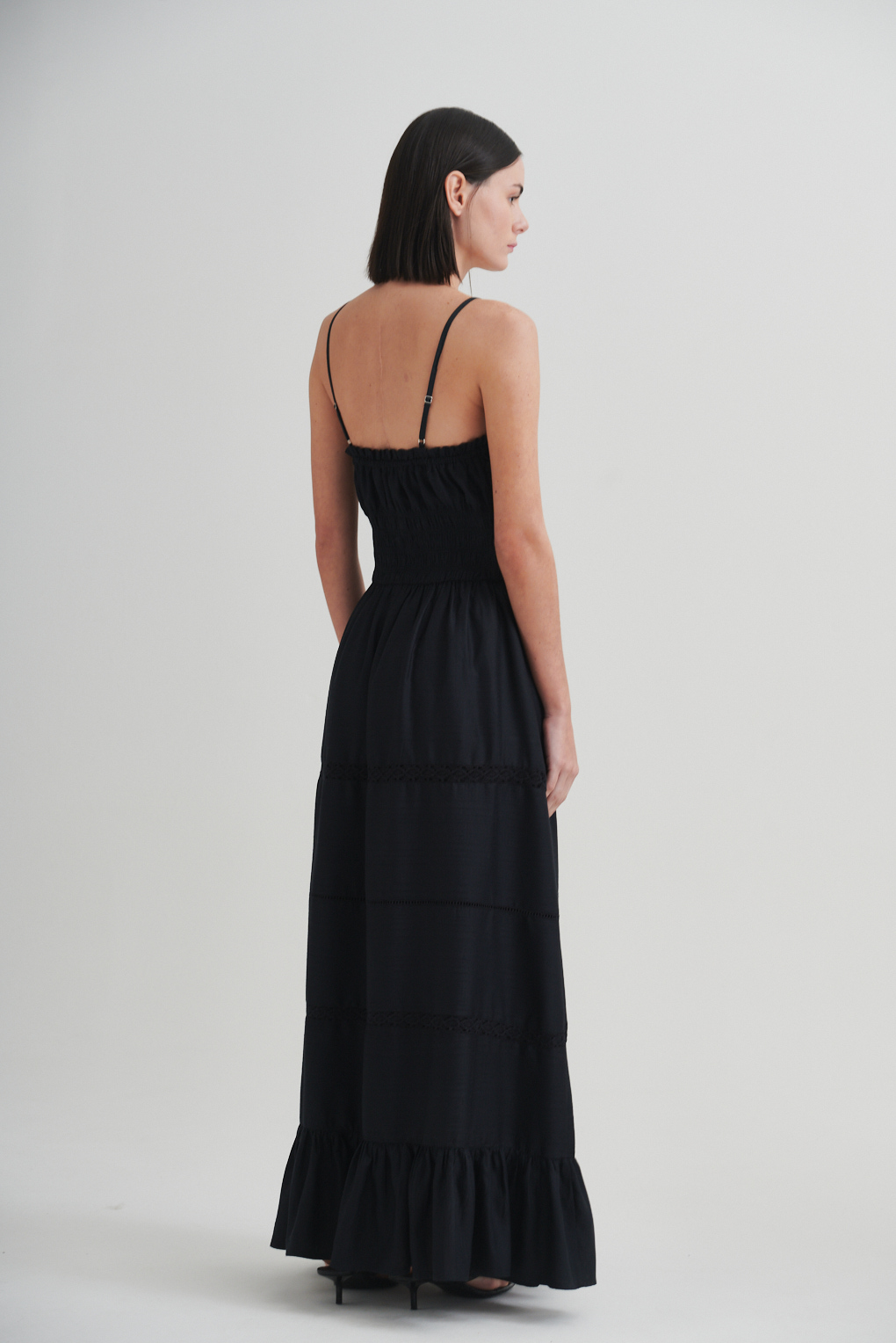 El vestido Serenity está confeccionado en algodón liviano, ideal para los días cálidos. Su diseño largo y fluido incluye delicados apliques de puntilla en el ruedo y a lo largo de la falda, aportando un aire romántico y fresco. El busto elastizado con frunces y lazo central realza la figura sin perder comodidad, mientras que los breteles finos regulables permiten un calce perfecto. Una prenda que combina suavidad, movimiento y estilo natural.
