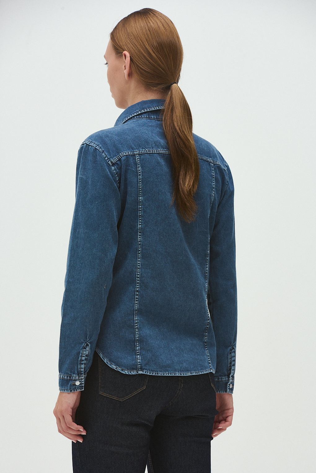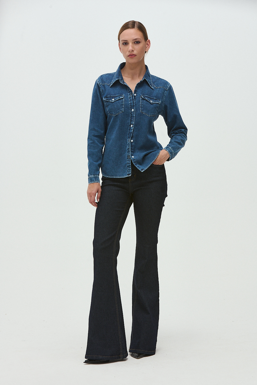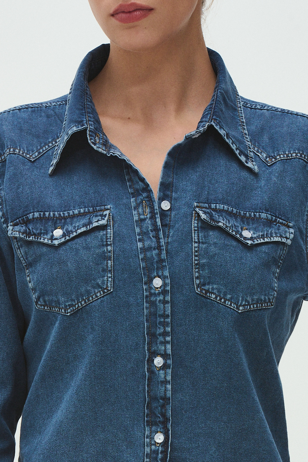 La Camisa Roma está confeccionada en denim, aportando estructura y un estilo atemporal. Su diseño presenta cuello clásico, cartera frontal con botones y bolsillos con tapa en el pecho, que suman un aire utilitario y moderno. Las mangas largas con puño completan esta prenda versátil, perfecta para combinar con jeans, pantalones o faldas y crear outfits urbanos y relajados.